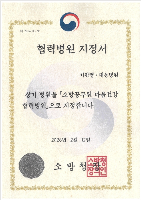 본원이 소방청으로부터 「소방공무원 마음건강 협력병원」 으로 공식 지정되었습니다.